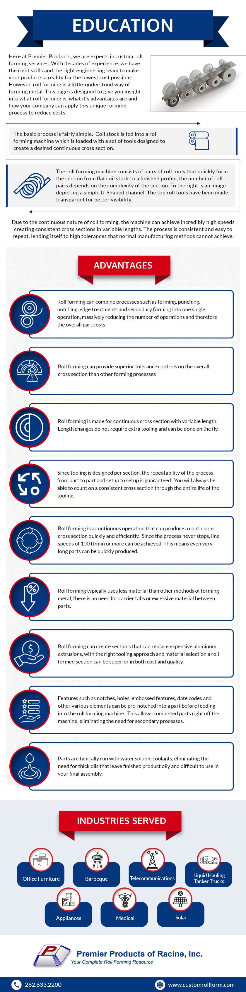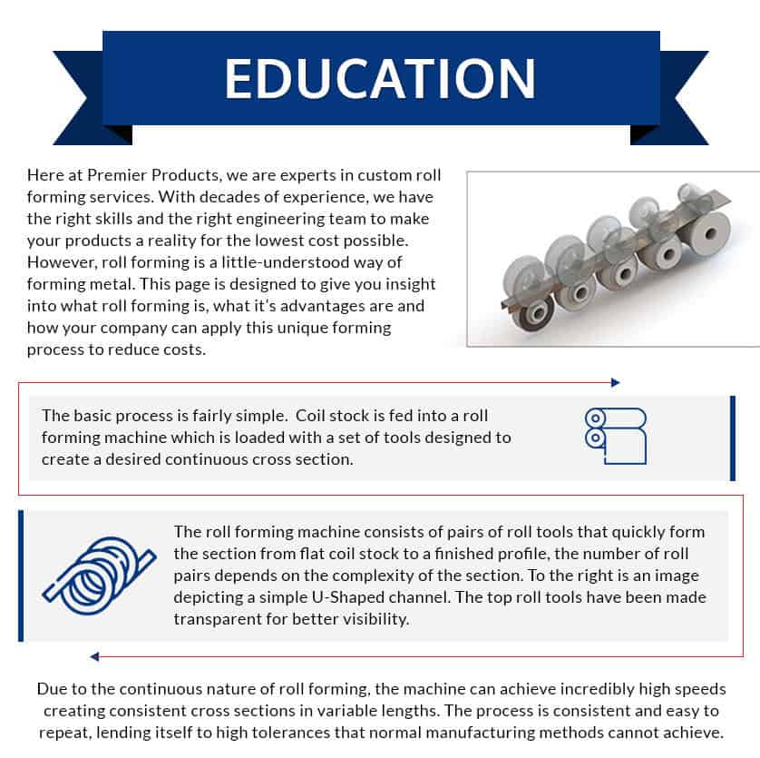 Here at Premier Products, we are experts in custom roll forming services. With decades of experience, we have the right skills and the right engineering team to make your products a reality for the lowest cost possible. However, roll forming is a little-understood way of forming metal. This page is designed to give you insight into what roll forming is, what it’s advantages are and how your company can apply this unique forming process to reduce costs.